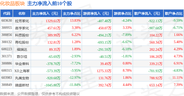 从资金流向上来看,当日化妆品板块主力资金净流出1.01亿元,游资资金净流出2493.63万元,散户资金净流入1.26亿元。化妆品板块个股资金流向见下表: