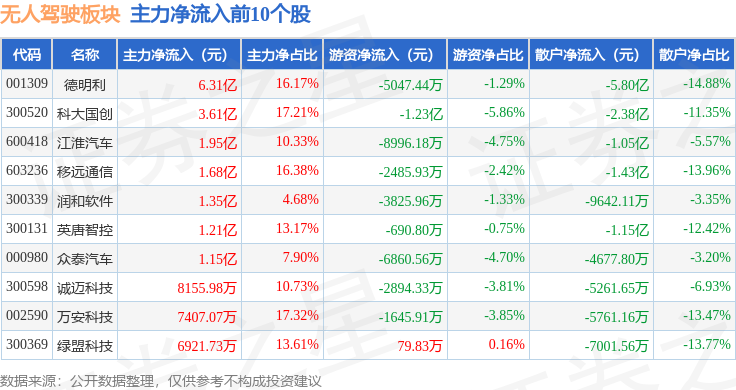 从资金流向上来看,当日无人驾驶板块主力资金净流出32.89亿元,游资资金净流入9.06亿元,散户资金净流入23.83亿元。无人驾驶板块个股资金流向见下表: