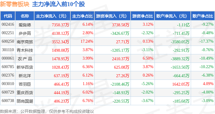 从资金流向上来看,当日新零售板块主力资金净流出5.68亿元,游资资金净流出1152.77万元,散户资金净流入5.8亿元。新零售板块个股资金流向见下表: