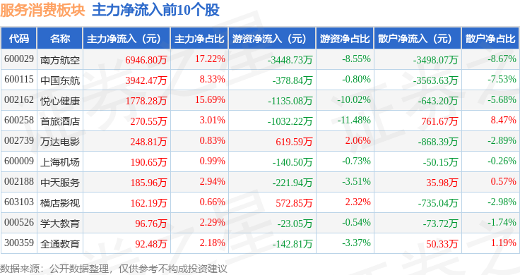 从资金流向上来看,当日服务消费板块主力资金净流出9948.94万元,游资资金净流出1407.73万元,散户资金净流入1.14亿元。服务消费板块个股资金流向见下表: