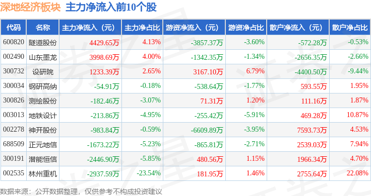 从资金流向上来看,当日深地经济板块主力资金净流出26.95亿元,游资资金净流入6.33亿元,散户资金净流入20.62亿元。深地经济板块个股资金流向见下表: