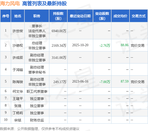 海力风电近半年内的董监高及核心技术人员增减持详情如下: