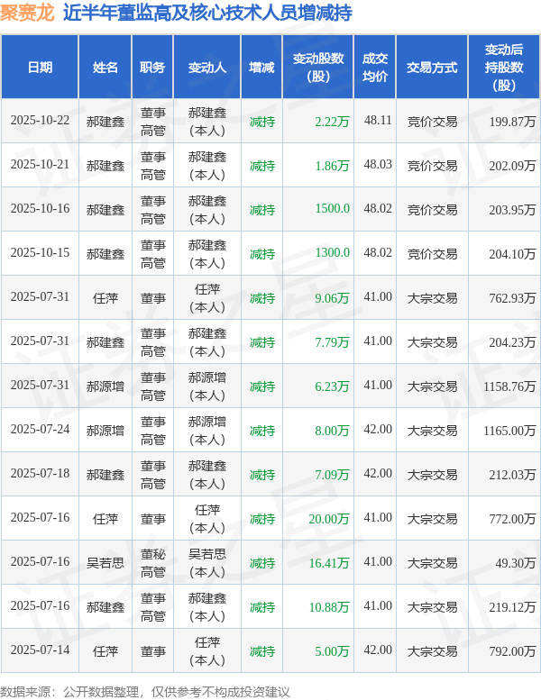 聚赛龙近半年内的董监高及核心技术人员增减持详情如下: