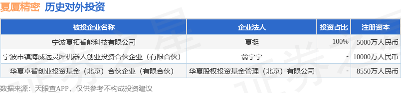 证券之星消息,根据天眼查APP显示,夏厦精密(001306.SZ)新增一起对外投资事件,被投资公司为宁波市镇海威远灵犀机器人创业投资合伙企业(有限合伙),法定代表人翁宁宁,投资占比为-。该公司从事资本市场服务,注册资本为10000万人民币。目前,夏厦精密共存在对外投资3项,详见下表: