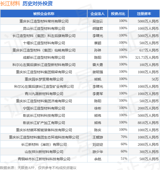 通过天眼查大数据分析,重庆长江造型材料(集团)股份有限公司共对外投资了30家企业,参与招投标项目128次;财产线索方面有商标信息53条,专利信息184条;此外企业还拥有行政许可23个。据2024年报数据,长江材料长期股权投资169.9万元。
