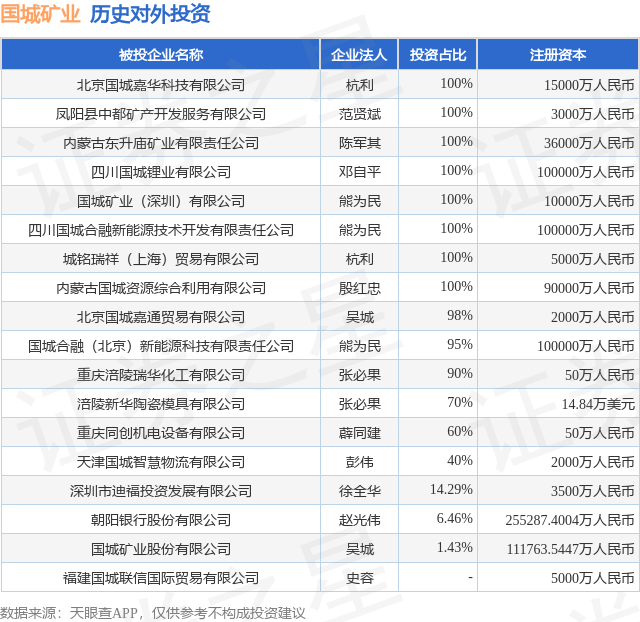 证券之星消息,根据天眼查APP显示,国城矿业(000688.SZ)新增一起对外投资事件,被投资公司为北京国城嘉通贸易有限公司,法定代表人吴城,投资占比为98%。该公司从事批发业,注册资本为2000万人民币。目前,国城矿业共存在对外投资18项,详见下表: