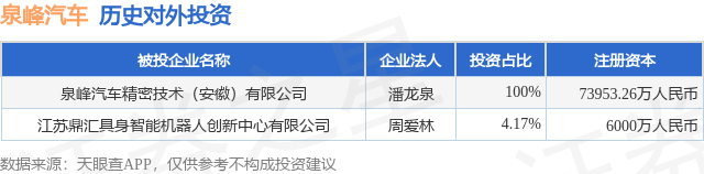 证券之星消息,根据天眼查APP显示,泉峰汽车(603982.SH)新增一起对外投资事件,被投资公司为江苏鼎汇具身智能机器人创新中心有限公司,法定代表人周爱林,投资占比为4.17%。该公司从事软件和信息技术服务业,注册资本为6000万人民币。目前,泉峰汽车共存在对外投资2项,详见下表: