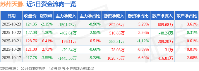 证券之星消息,截至2025年10月23日收盘,苏州天脉(301626)报收于124.35元,下跌2.15%,换手率5.22%,成交量1.36万手,成交额1.69亿元。