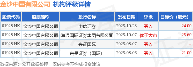 投行对该股的评级以买入为主,近90天内共有3家投行给出买入评级,近90天的目标均价为23.53港元。中信证券最新一份研报给予金沙中国有限公司买入评级,目标价24港元。