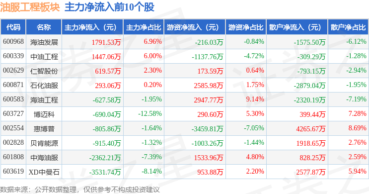 从资金流向上来看,当日油服工程板块主力资金净流出1.85亿元,游资资金净流出2335.06万元,散户资金净流入2.09亿元。油服工程板块个股资金流向见下表: