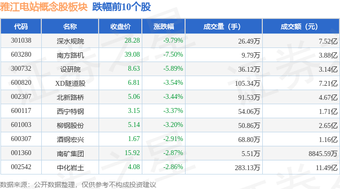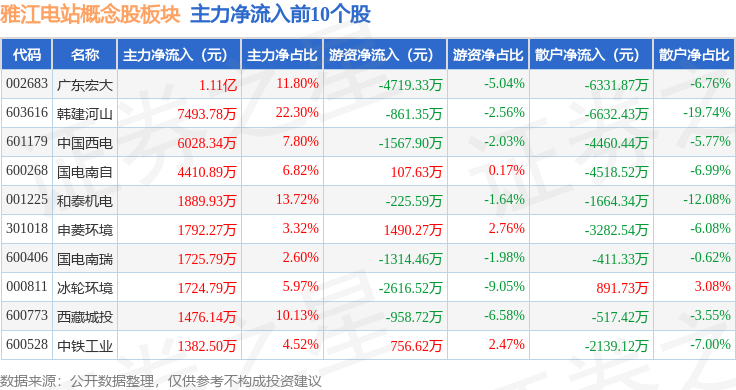 从资金流向上来看,当日雅江电站概念股板块主力资金净流出9.17亿元,游资资金净流入56.18万元,散户资金净流入9.16亿元。雅江电站概念股板块个股资金流向见下表: