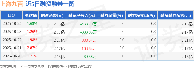 上海九百融资融券信息显示,融资方面,当日融资买入937.12万元,融资偿还1375.32万元,融资净偿还438.2万元。融券方面,融券卖出0.0股,融券偿还0.0股,融券余量0.0股,融券余额0.0万元。融资融券余额2.13亿元。
