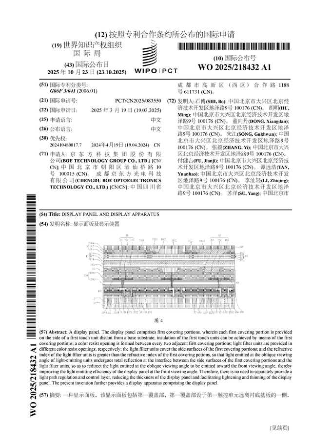 证券之星消息,根据企查查数据显示京东方A(000725)公布了一项国际专利申请,专利名为“显示面板及显示装置”,专利申请号为PCT/CN2025/083550,国际公布日为2025年10月23日。