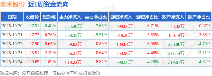 资金流向数据方面,本周泰禾股份主力资金合计净流出25.27万元,游资资金合计净流入671.46万元,散户资金合计净流出646.2万元。本周资金流向一览见下表: