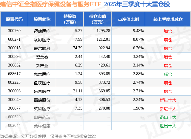 从基金规模来看,建信中证全指医疗保健设备与服务ETF基金2025年三季度公布的基金规模为1.37亿元,较上一期规模1.17亿元变化了2002.61万元,环比变化了17.18%。该基金最新一期资产配置为:股票占净值比98.93%,无债券类资产,现金占净值比1.2%。从基金持仓来看,该基金当季前十大股票仓位达44.04%,第一大重仓股为迈瑞医疗(300760),持仓占比为9.48%。