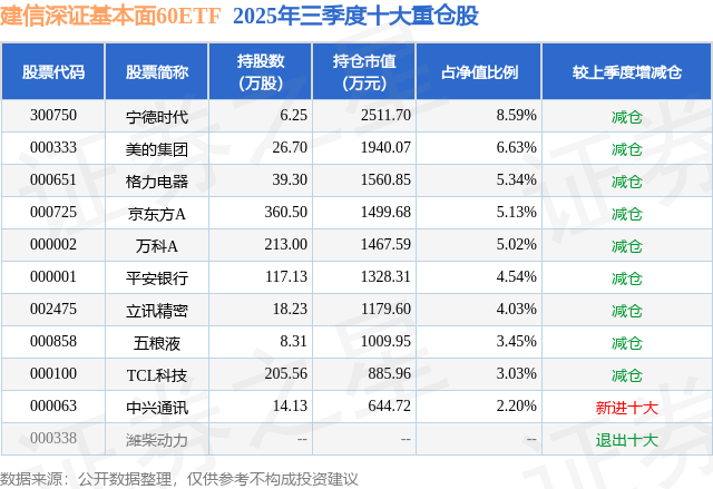 从基金规模来看,建信深证基本面60ETF基金2025年三季度公布的基金规模为2.92亿元,较上一期规模3.47亿元变化了-5480.42万元,环比变化了-15.78%。该基金最新一期资产配置为:股票占净值比99.4%,无债券类资产,现金占净值比0.69%。从基金持仓来看,该基金当季前十大股票仓位达47.96%,第一大重仓股为宁德时代(300750),持仓占比为8.59%。