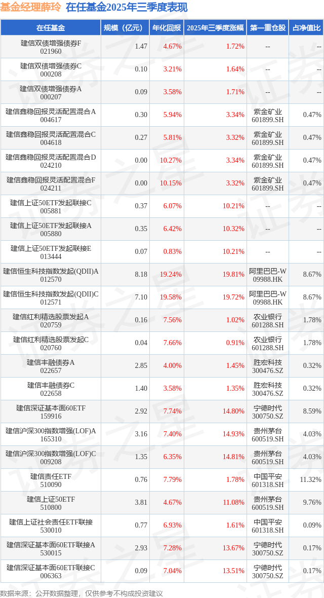建信深证基本面60ETF现任基金经理为薛玲。其中在任基金经理薛玲已从业9年又116天,2017年9月28日正式接手管理建信深证基本面60ETF,任职期间累计回报为52.91%。目前还管理着24只基金产品(包括A类和C类),其中本季度表现最佳的基金为建信恒生科技指数发起(QDII)A(012570),季度净值涨幅为19.81%。