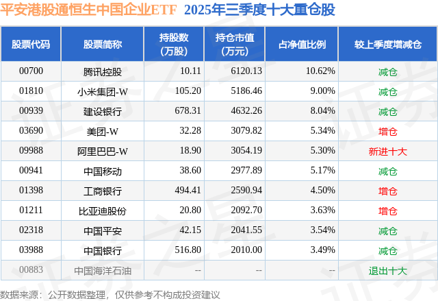 从基金规模来看,平安港股通恒生中国企业ETF基金2025年三季度公布的基金规模为5.76亿元,较上一期规模5.47亿元变化了2899.37万元,环比变化了5.3%。该基金最新一期资产配置为:股票占净值比97.78%,无债券类资产,现金占净值比2.05%。从基金持仓来看,该基金当季前十大股票仓位达58.63%,第一大重仓股为腾讯控股(00700),持仓占比为10.62%。
