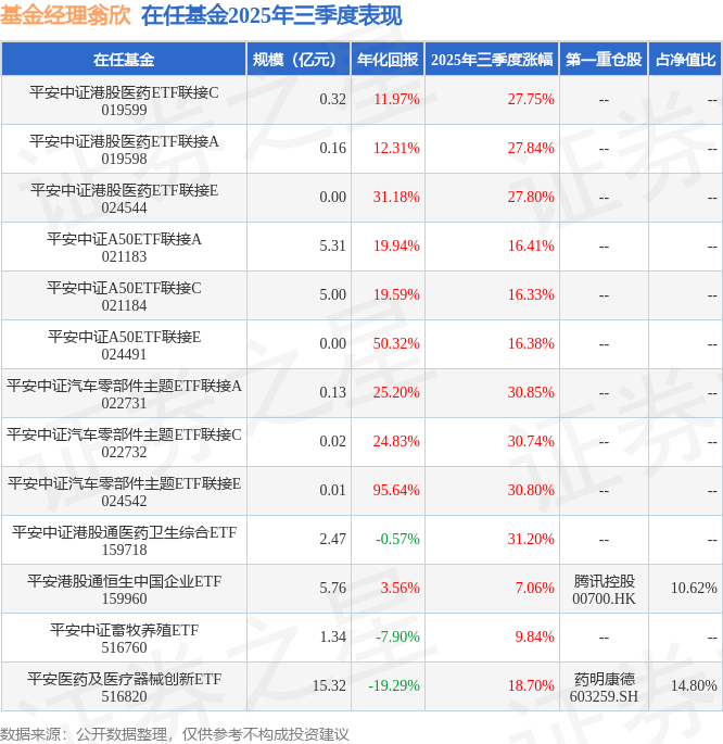 平安港股通恒生中国企业ETF现任基金经理为翁欣。其中在任基金经理翁欣已从业1年又316天,2024年7月30日正式接手管理平安港股通恒生中国企业ETF,任职期间累计回报为50.79%。目前还管理着13只基金产品(包括A类和C类),其中本季度表现最佳的基金为平安中证港股通医药卫生综合ETF(159718),季度净值涨幅为31.2%。