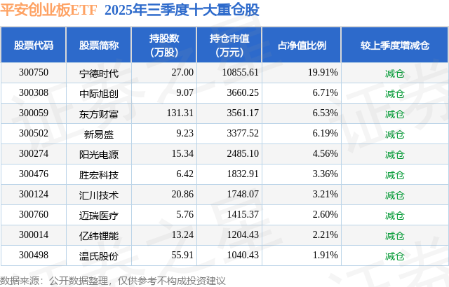 从基金规模来看,平安创业板ETF基金2025年三季度公布的基金规模为5.45亿元,较上一期规模4.88亿元变化了5714.74万元,环比变化了11.71%。该基金最新一期资产配置为:股票占净值比99.45%,无债券类资产,现金占净值比1.33%。从基金持仓来看,该基金当季前十大股票仓位达57.19%,第一大重仓股为宁德时代(300750),持仓占比为19.91%。