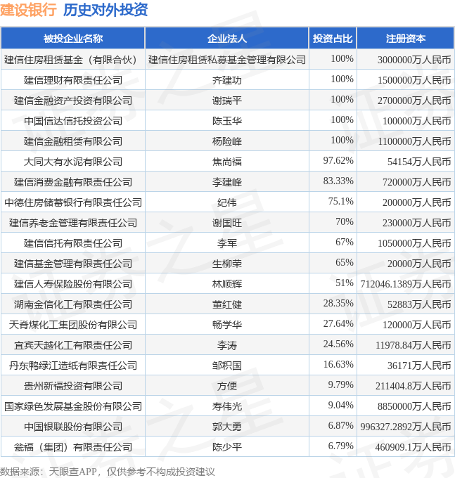 通过天眼查大数据分析,中国建设银行股份有限公司共对外投资了921家企业,参与招投标项目60416次;财产线索方面有商标信息2436条,专利信息13123条,著作权信息1101条;此外企业还拥有行政许可148个。据2024年报数据,建设银行商誉25.22亿元,同比增2.69%。长期股权投资235.6亿元,同比增12.28%。