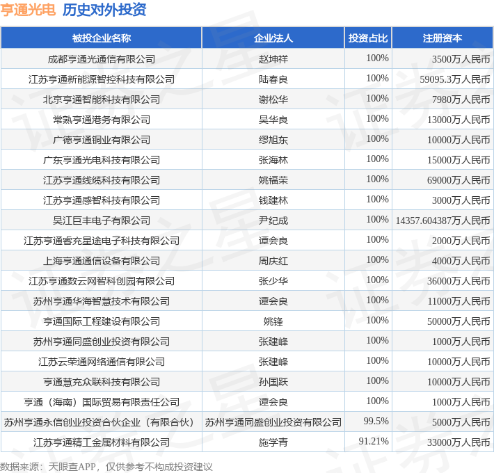 证券之星消息,根据天眼查APP显示,亨通光电(600487.SH)新增一起对外投资事件,被投资公司为苏州千帆企航叁号股权投资合伙企业(有限合伙),法定代表人农银资本管理有限公司,投资占比为10%。该公司从事资本市场服务,注册资本为50000万人民币。目前,亨通光电共存在对外投资69项,投资占比前20的项目见下表: