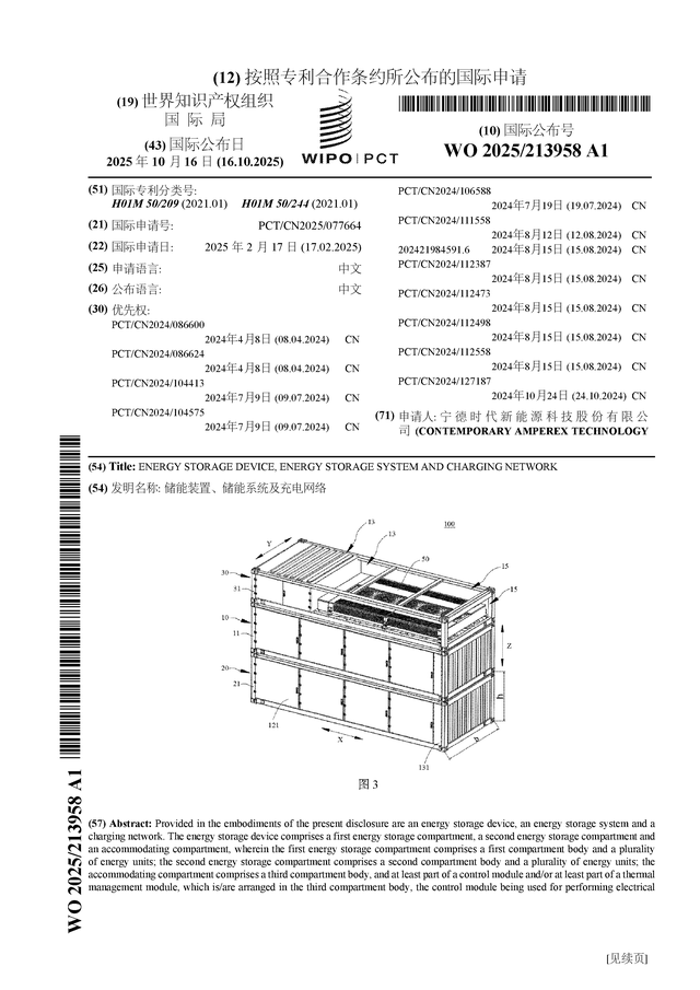 证券之星消息,根据企查查数据显示宁德时代(300750)公布了一项国际专利申请,专利名为“储能装置、储能系统及充电网络”,专利申请号为PCT/CN2025/077664,国际公布日为2025年10月16日。