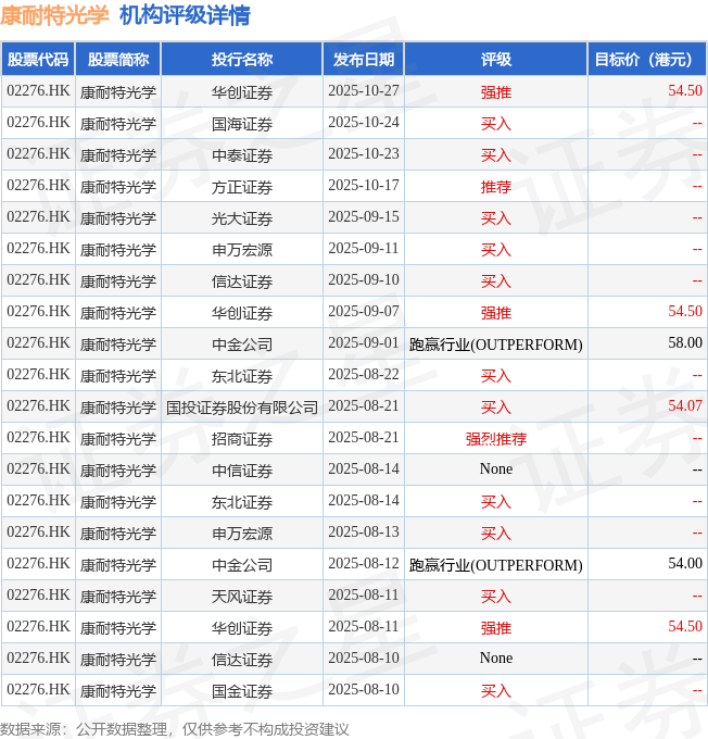 投行对该股的评级以买入为主,近90天内共有11家投行给出买入评级,近90天的目标均价为54.93港元。华创证券最新一份研报给予康耐特光学强推评级,目标价54.5港元。