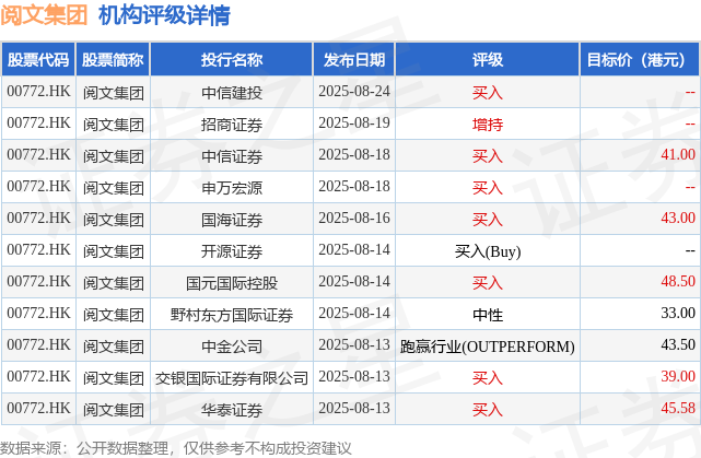 投行对该股的评级以买入为主,近90天内共有7家投行给出买入评级,近90天的目标均价为41.94港元。中信建投最新一份研报给予阅文集团买入评级。