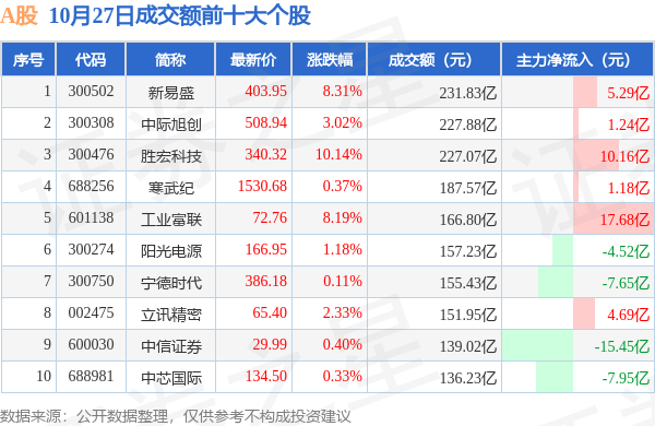 当日A股成交额前10大个股全线收涨,平均涨幅3.44%,其中新易盛(300502)以成交额231.83亿元排第一。从主力资金流入看,成交额前10大个股中有6只个股呈现主力资金净流入。