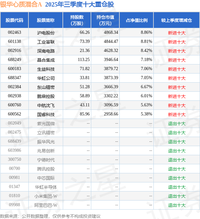 根据2025基金Q3季报公募基金重仓股数据,重仓该股的公募基金共12家,其中持有数量最多的公募基金为银华基金的银华心质混合A。银华心质混合A目前规模为2.67亿元,最新净值1.3402(10月24日),较上一交易日上涨6.09%,近一年上涨53.38%。该公募基金现任基金经理为张萍 杜宇。张萍在任的基金产品包括:银华盛世精选灵活配置混合发起式A,管理时间为2018年11月6日至今,期间收益率为102.53%;银华中小盘混合,管理时间为2018年11月6日至今,期间收益率为203.68%;银华心诚灵活配置混合A,管理时间为2019年3月19日至今,期间收益率为97.97%;银华心怡灵活配置混合A,管理时间为2019年9月20日至今,期间收益率为131.46%。杜宇在任的基金产品包括:银华中小盘混合,管理时间为2019年12月11日至今,期间收益率为89.95%;银华丰享一年持有期混合,管理时间为2022年1月26日至今,期间收益率为11.14%;银华心佳两年持有期混合,管理时间为2025年4月30日至今,期间收益率为50.9%。