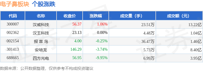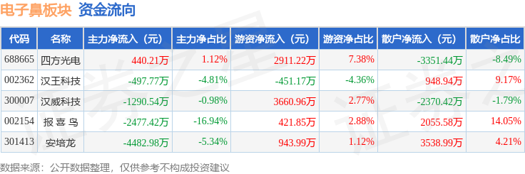 从资金流向上来看,当日电子鼻板块主力资金净流出8308.5万元,游资资金净流入7486.85万元,散户资金净流入821.65万元。电子鼻板块个股资金流向见下表: