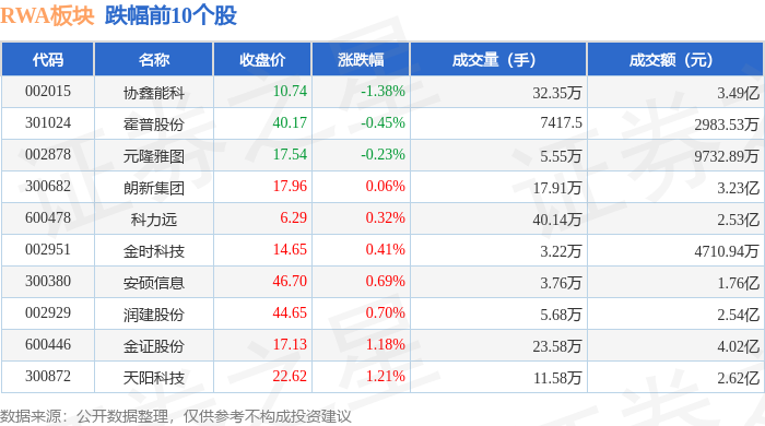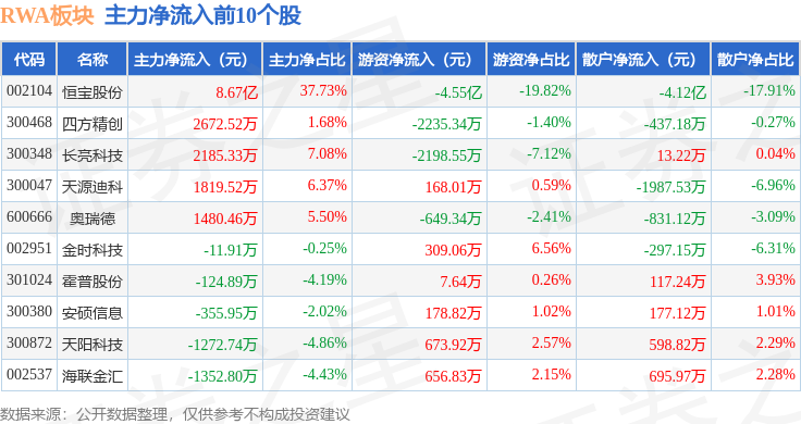 从资金流向上来看,当日RWA板块主力资金净流入7.71亿元,游资资金净流出4.07亿元,散户资金净流出3.64亿元。RWA板块个股资金流向见下表: