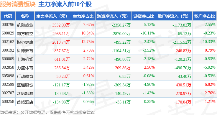 从资金流向上来看,当日服务消费板块主力资金净流出2.55亿元,游资资金净流入8287.27万元,散户资金净流入1.72亿元。服务消费板块个股资金流向见下表: