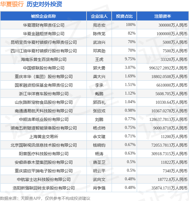 通过天眼查大数据分析,华夏银行股份有限公司共对外投资了32家企业,参与招投标项目4221次;财产线索方面有商标信息540条,专利信息38条,著作权信息95条;此外企业还拥有行政许可41个。