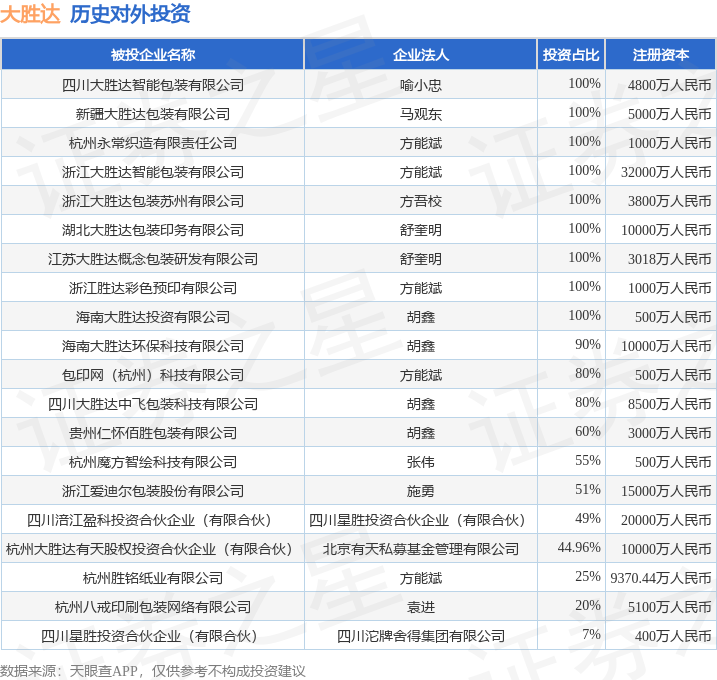 通过天眼查大数据分析,浙江大胜达包装股份有限公司共对外投资了24家企业,参与招投标项目48次;财产线索方面有商标信息1条,专利信息318条,著作权信息15条;此外企业还拥有行政许可48个。据2024年报数据,大胜达商誉3.98亿元,同比增53.88%。长期股权投资9899.39万元。