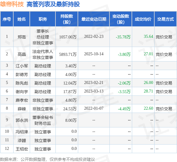 雄帝科技的高管列表及最新持股情况如下:
