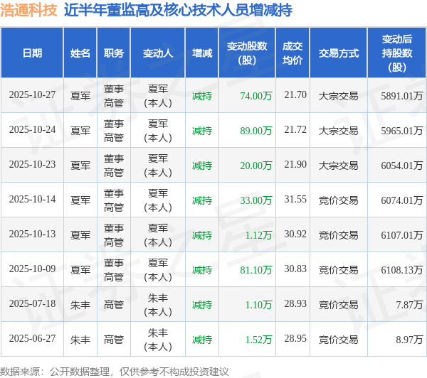 浩通科技近半年内的董监高及核心技术人员增减持详情如下: