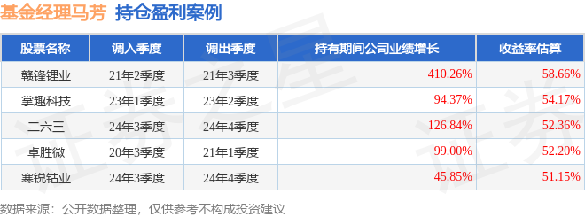 马芳管理的国金量化多策略A基金在21年2季度买入赣锋锂业,在持有1个季度后在21年3季度卖出。持有期间的估算收益率为58.66%,持有期间赣锋锂业在2020年到2021年的年报归属净利润增幅达410.26%。