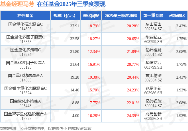 证券之星消息,截止2025年三季度末,基金经理马芳旗下共管理8只基金,本季度表现最佳的为国金智享量化选股混合A(018823),季度净值涨24.39%。