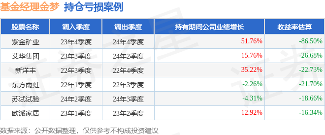金梦管理的天弘通利混合A基金在23年4季度买入紫金矿业,在持有1年又0个季度后在24年4季度卖出。持有期间的估算收益率为-86.5%,持有期间紫金矿业在2023年到2024年的年报归属净利润增幅达51.76%。