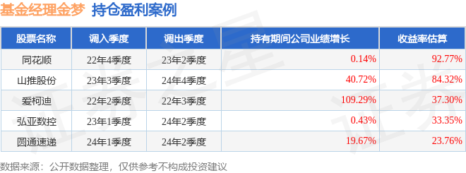 金梦管理的天弘通利混合A基金在22年4季度买入同花顺,在持有2个季度后在23年2季度卖出。持有期间的估算收益率为92.77%,持有期间同花顺在2022年到2023年的年报营业总收入增幅达0.14%。