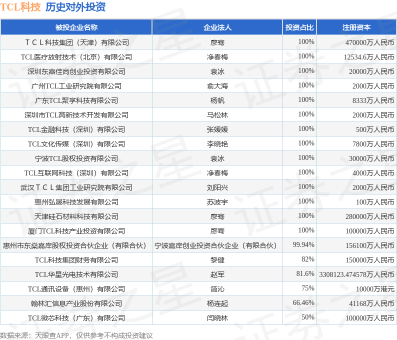 证券之星消息,根据天眼查APP显示,TCL科技(000100.SZ)新增一起对外投资事件,被投资公司为深圳市九天智城超高清视频显示产业私募创业投资基金合伙企业(有限合伙),法定代表人深圳市九天智城管理咨询合伙企业(有限合伙),投资占比为30%。该公司从事资本市场服务,注册资本为200000万人民币。目前,TCL科技共存在对外投资42项,投资占比前20的项目见下表: