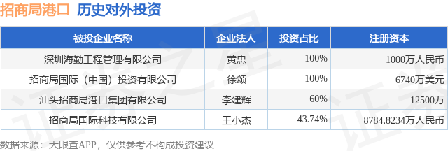 证券之星消息,根据天眼查APP显示,招商局港口(00144.HK)新增一起对外投资事件,被投资公司为汕头招商局港口集团有限公司,法定代表人李建辉,投资占比为60%。该公司从事水上运输业,注册资本为12500万。目前,招商局港口共存在对外投资4项,详见下表: