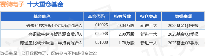 持有赛微电子最多的基金为兴银科技增长1个月滚动混合A,目前规模为0.95亿元,最新净值1.317(10月27日),较上一交易日上涨3.62%,近一年上涨56.58%。该基金现任基金经理为张世略。