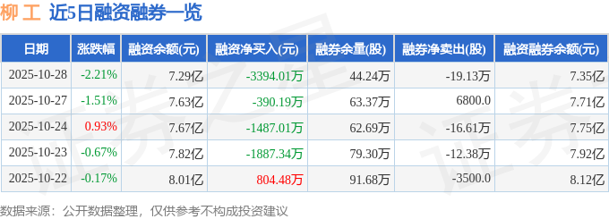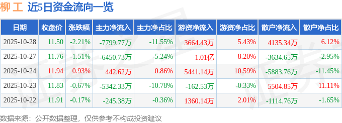 证券之星消息,截至2025年10月28日收盘,柳 工(000528)报收于11.5元,下跌2.21%,换手率2.88%,成交量58.56万手,成交额6.75亿元。