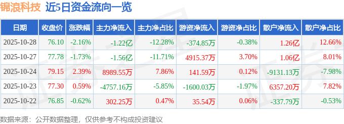 10月28日的资金流向数据方面,主力资金净流出1.22亿元,占总成交额12.28%,游资资金净流出374.85万元,占总成交额0.38%,散户资金净流入1.26亿元,占总成交额12.66%。
