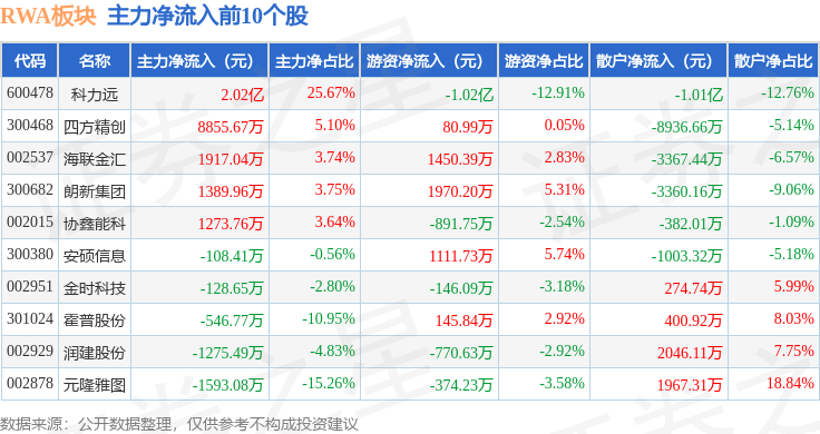 从资金流向上来看,当日RWA板块主力资金净流出161.68万元,游资资金净流出450.45万元,散户资金净流入612.13万元。RWA板块个股资金流向见下表: