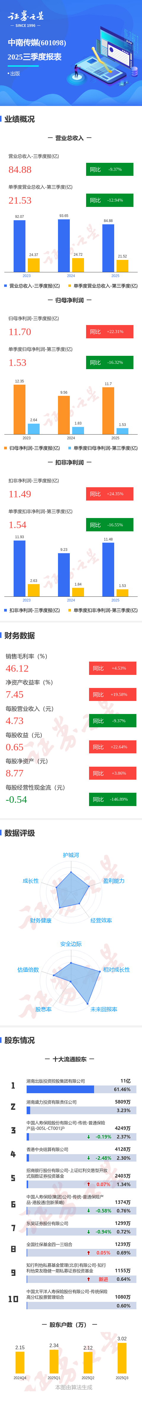 证券之星消息,中南传媒2025年三季报显示,前三季度公司主营收入84.88亿元,同比下降9.37%;归母净利润11.7亿元,同比上升22.32%;扣非净利润11.49亿元,同比上升24.35%;其中2025年第三季度,公司单季度主营收入21.53亿元,同比下降12.94%;单季度归母净利润1.53亿元,同比下降16.33%;单季度扣非净利润1.54亿元,同比下降16.56%;负债率38.3%,投资收益4829.97万元,财务费用-4319.33万元,毛利率46.12%。