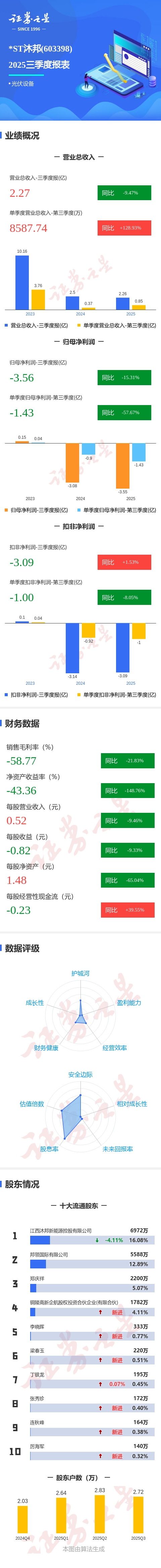 证券之星消息,*ST沐邦2025年三季报显示,前三季度公司主营收入2.27亿元,同比下降9.48%;归母净利润-3.56亿元,同比下降15.31%;扣非净利润-3.09亿元,同比上升1.54%;其中2025年第三季度,公司单季度主营收入8587.74万元,同比上升128.93%;单季度归母净利润-1.43亿元,同比下降57.67%;单季度扣非净利润-1.0亿元,同比下降8.06%;负债率82.22%,财务费用5798.43万元,毛利率-58.77%。